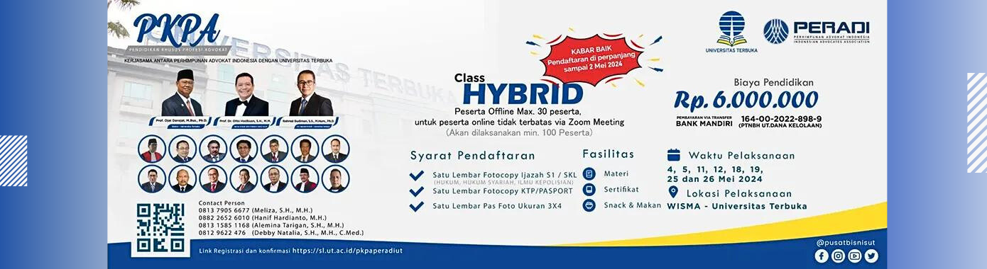 - Pendaftaran Pendidikan Khusus Profesi Advokat (PKPA) Kerja Sama Perhimpunan Advokat Indonesia (PERADI) dan Universitas Terbuka diperpanjang sampai dengan 2 Mei 2024
